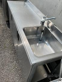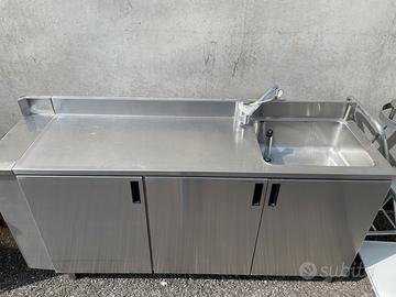 Lavello professionale in acciaio inox completo di ante e piano di appoggio. Misure: Lunghezza 1.80 m Profondità 50 cm Altezza 89cm Dimensione lavandino 50 x 40 cm