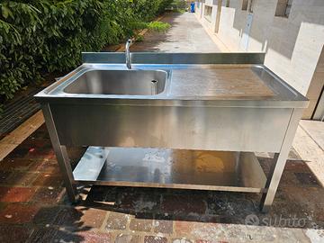 Lavello a giorno con ripiano inferiore. 140x70cm h.80cm alzatina 10cm. Gruppo miscelatore a pedale e piletta di scarico. Tutto tenuto molto bene.