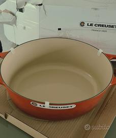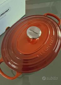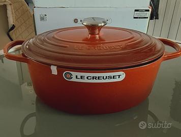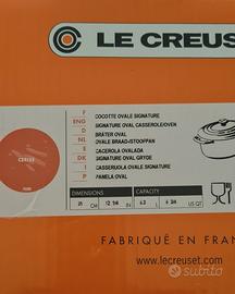Le creuset cocotte ovale signature cm 31 capacità lt 6,3 in ghisa smaltata vetrificata nel suo imballo originale (cartone rotto a lato) mai usata. Artigianalmente é prodotta in Francia compatibile con tutte le fonti di calore compreso forno vendo per inutilizzo solo consegna a mano Roma sud