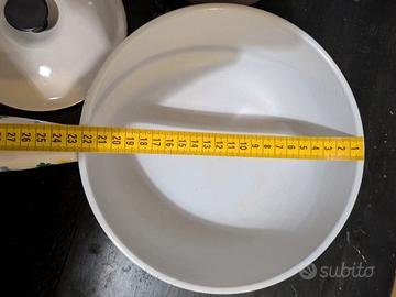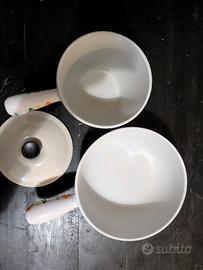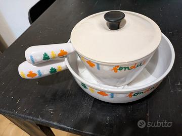 coppia di pentole le creuset in ghisa smaltata per fondue. quella piccola da 16 è pensata per la buorguignonne mentre quella da 22 per la fondue savoiarde entrambe possono tranquillamente essere utilizzate per le normali cotture sono in buon condizioni e presentano qualche lieve segno del tempo