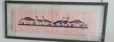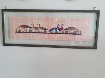Vendo bellissimo quadro orizzontale contenente un autentico papiro egiziano dipinto a mano. Un complemento d'arredo elegante e dal fascino etnico, perfetto per dare un tocco originale a un corridoio, un salotto o uno studio. Caratteristiche: Soggetto: La pittura riproduce le celebri "Oche di Meidum", uno dei capolavori più famosi dell'antica arte egizia, dipinte con grande cura e colori vivaci. In basso a destra è presente la firma dell'artista. Materiale: Vero papiro egiziano. Come si può notare dalle foto, sono ben visibili le tipiche fibre vegetali intrecciate e i caratteristici bordi irregolari della carta artigianale. Cornice: Il papiro è valorizzato da un'elegante cornice scura su misura, dotata di vetro protettivo, che lo fa risaltare come "sospeso" sul fondo chiaro. Condizioni: Il quadro è in ottime condizioni estetiche. Il papiro è perfettamente conservato e protetto, il vetro è integro e la cornice è solida e provvista dei ganci posteriori, subito pronta per essere appesa alla parete. Ritiro a mano a Torino (zona Santa Rita) Disponibile per altre foto. Prezzo trattabile.