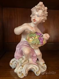 Raffinato set di quattro statuine in porcellana policroma finemente lavorata, raffiguranti le Allegorie delle Quattro Stagioni. Ogni fanciullo è caratterizzato dai simboli iconografici della tradizione classica: