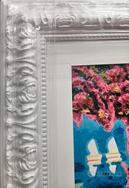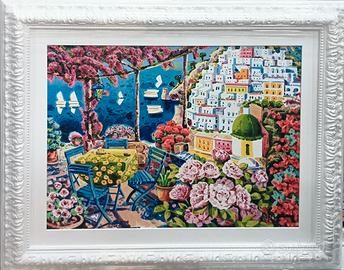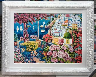 Bellissima opera in cornice bianca artigianalead angolo chiuso, lavorata e dipinta a mano. Lo stile barocco lega con le splendide opere del Maestro che dipinge il sole alto, la luce e il racconto semplice.