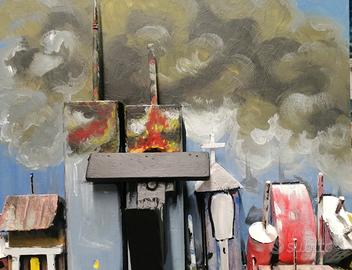 Le Torri Gemelle, Scultura in legno e tecnica mista su tavola cm. 60x30x9, anno 2025, opera unica originale.