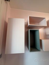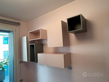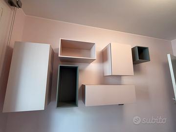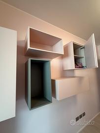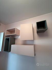 composizione di contenitori in legno laccato grigio e rosa petalo ( si posso montare in qualsiasi posizione ) e in qualsiasi stanza .