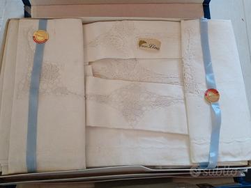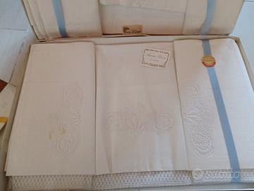 Vendo completo di lenzuola matrimoniali, copriletto ed asciugamani in lino con ricamo a mano NUOVI ad € 50