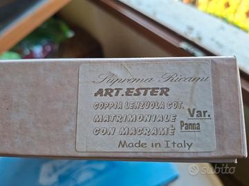 Vendo completo lenzuola matrimoniale nuovo in confezione integra,fa parte di corredo matrimoniale, con MACRARE. composto da lenzuola sotto e lenzuolo sopra più 2 federe. colore panna.