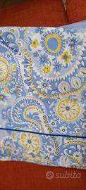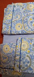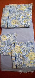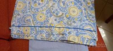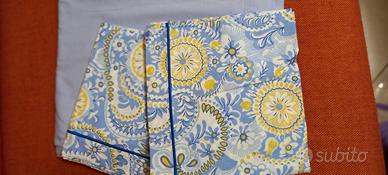 vendo parure bellisomo completa per letto Matrimoniale composto da lenzuolo sopra,lenzuolo sotto senza angoli e 2 federe cuscini, in puro cotone, fantasia colore azzurre e giallo .Nuovo mai usato ma senza scatola in puro