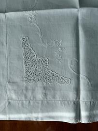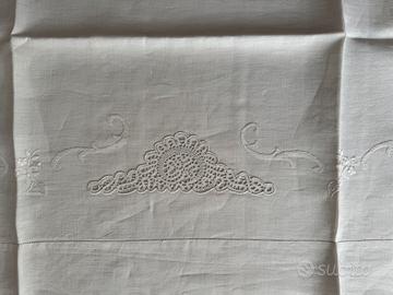 - Lenzuolo matrimoniale sopra di lino bianco ricamato completamente a mano con inserti di pizzo di Cantù. Misure 230 cm x 280 cm