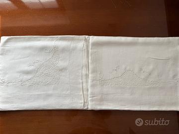 - 2 federe coordinate al lenzuolo, della stessa stoffa e con gli stessi inserti. Ricamate a mano con pizzo di Cantù.