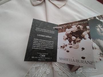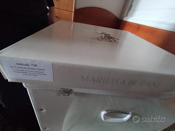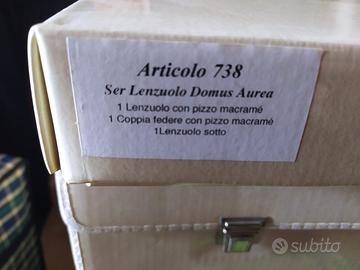 Set Lenzuola Matrimoniali sopra e sotto e coppia federe con pizzo macramè, Mariella Burani, nuovo mai utilizato con certificato di autenticità