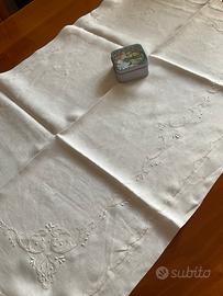 Lenzuola vintage in puro lino avorio , ricamate a mano in una leggera tonalità più scura, bordo rifinito sempre a mano con doppio orlo rricamato a punto ombra, misura m.2,70 per 2,40 circa, mentre le federe abbinate sono cm.84 per 55. Mai usato, solo rinfrescato per la lunga conservazione