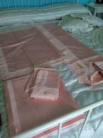 Bellissima parure di lenzuola matrimoniali in puro raso di colore rosa, con bordatura in pizzo macramè. Mai usati, ma senza scatola.