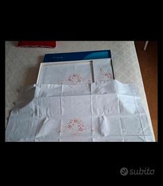 Lenzuola matrimoniali con semplici ricami. Sopra e 2 federe. Marca Bassetti. Scatola originale