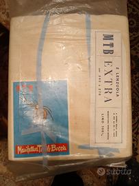 Vendesi lenzuola matrimoniali nuove 100% lino antico ossia, tra l'altro, ANCHE LINO BIOLOGICO. Trattasi di lino di qualità superiore anche all'epoca in cui sono state prodotte le lenzuola (circa 60 anni fa). Le lenzuola hanno le seguenti dimensioni : cm 270 X 240. Viste le dimensioni, un lenzuolo puo' essere utilizzato ANCHE come tenda OVVERO da un solo lenzuolo possono ricavarsi piu' asciugamani e/o strofinacci ( la canapa ed il lino, ancor piu' del cotone, sono ottime fibre perche' sono igroscopiche, ossia assorbono molta acqua ). Le lenzuola non hanno la piega alle estremità, perché 60 anni fa cosi erano vendute (all'epoca erano rifinite anche con ricami quali, ad esempio, le iniziali). Le lenzuola sono con marca " Langella" e Vittoria " tessiture in Scafati (attualmente Vittoria e' ancora in attività), nonché marca Boccia ( Tessitura in Terzigno non più esistente ). Il prezzo per il singolo lenzuolo è di euro 65 oltre spese di spedizione. E' possibile vendere anche un solo lenzuolo (anche se le lenzuola si presentano in confezione originale composta da n. 2 lenzuola). Se si acquista più di un lenzuolo le spese di spedizione sono le medesime ( anche se le spese di spedizione sono più elevate se si spedisce più di un lenzuolo). Trattasi di lenzuola prodotte circa 60 anni fa.
