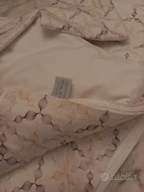 Lenzuola matrimoniali in raso di cotone firmate Palombella Firenze un marchio prestigioso,le due federe hanno fantasia geometrica accompagnate al bordo del lenzuola,bianco il coprimaterasso. Sono morbide..mai usate,ho buttato confezione