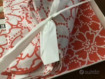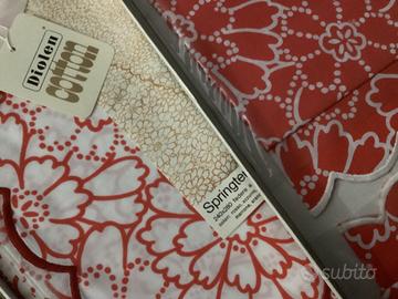 Set matrimoniale ditta Gabel stampato in Diolen cotton 4 pezzi composto da lenzuolo sotto fondo rosso + lenzuolo sopra fondo bianco 240 x 280 + 2 grandi federe a 3 volants fondo rosso--bordi smerlati stampa molto attuale Nuovo perfetto anni '60 - La composizione unisce la resistenza del poliestere alla praticità del cotone rende il tessuto indeformabile (non si stropiccia facilmente) e altamente durevole nel tempo e i colori sono resistenti ad innumerevoli lavaggi- Facilissimo da stirare Oggi questo tipo di mischia (come anche i tessuti Estoril) sono considerati innovativi (...eppure risalgono agli anni '60) utilizzati per la loro resistenza e versatilità ...per esempio sono utilizzati per la casa ma anche in molti capi di abbigliamento sportivo Vendita tra privati con la formula Visto e piaciuto come da normativa UE Consegna in zona o spedizione tracciabile--bonifico Solo contatti diretti in chat di subito non utilizzo la nuova chat tutto subito