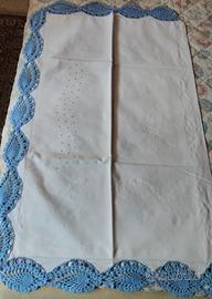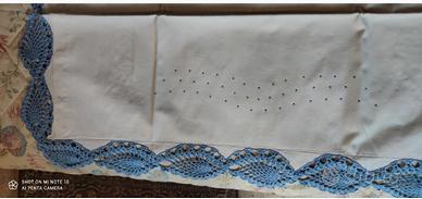 vendo 1 lenzuolo completo di federe con ricamo azzurro e bordo fatto a mano a uncinetto euro 70 ;