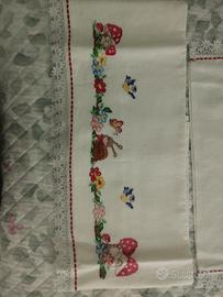 vendo per inutilizzo,realizzato a mano.disegno realizzato a punto croce..e lavorato all uncinetto il bordino e confezionato dalla sottoscritta.