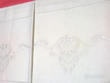 Lenzuolo con due federe puro cotone ecru' ricamato a mano.