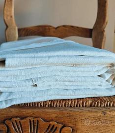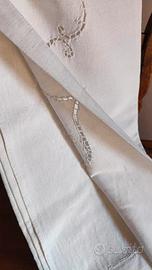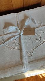 Antico lenzuolo, dalla trama tenace, rustica,robusta e consistente,realizzato a tre teli, perfettamente cuciti assieme secondo l'arte antica di giuntare i tessuti, colore bianco con ricami a intaglio e iniziali MA ricamate a mano al centro della balza.