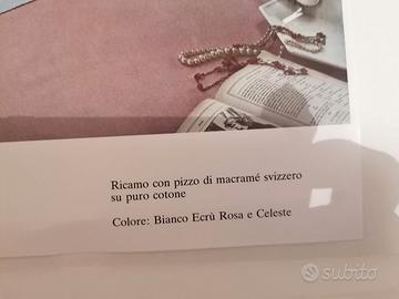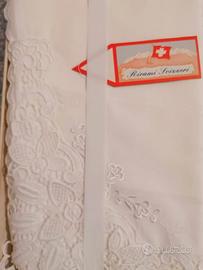 Vendo lenzuolo bianco completo di due federe con volant su 3 lati ricami in pizzo macramè svizzero in puro cotone