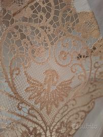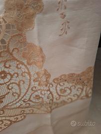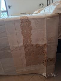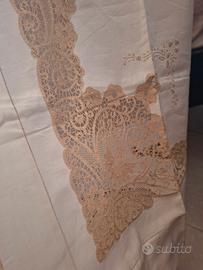 Meraviglioso lenzuolo in puro lino lavorato a mano in pizzo Cantù,colore beige.Nel ricamo si possono apprezzare degli angioletti.Nuovo