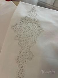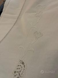 lenzuolo matrimoniale e due federe finemente ricamati con tecnica a tombolo.