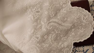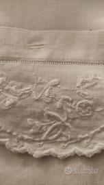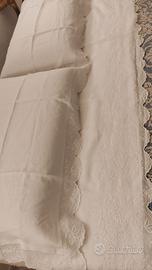 nuovo lenzuolo con federe puro lino di qualità eccellente ricamo a mano di Madeira originale con balza ricamo alto cm 20 continuo su angoli....Chiude il perimetro del lenzuolo l ' orlo a giorno euro130..cm 270 x 260 coperta copriletto in filet in lino dal disegno floreale rifinito con ricamo a mano su tutto il copriletto.....mai usato cm 260 x 200 circa ... prezzo euro 100.. completo prezzo 220