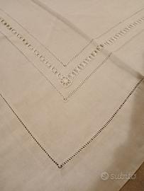 Splendido lenzuolo di lino matrimoniale con 2 federe, da corredo anni 50, mai usato riccamente ricamato con grande stemma della famiglia Verratti, da cui il verro rappresentato, monogramma OV e bordure a orlo a giorno e gigliuccio.