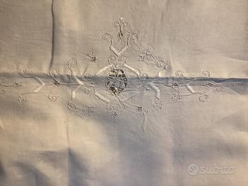Lenzuolo matrimoniale inizio del 900 di Lino finemente ricamato a mano con 2 federe a corredo