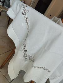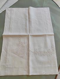 Lenzuolo matrimoniale di pregiata fattura con due federe di lino purissimo, realizzato a mano nel laboratorio di ricamo delle suore San Giuseppe di Mileto (VV) circa 80 anni fa.