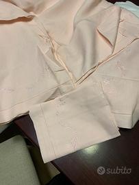 Completo lenzuolo matrimoniale (lenzuolo sopra, lenzuolo sotto e due federe), in lino ricamato a mano, nuovo, colore rosa