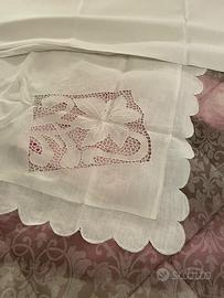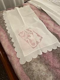 Lenzuolo completo di 2 federe in lino purissimo di prima scelta, ricamato e intagliato interamente a mano usando filati pregiati, realizzato da una ricamatrice espertissima, molto precisa e attenta ad ogni particolare. Mai usato. Prezzo richiesto Euro 2.500,00