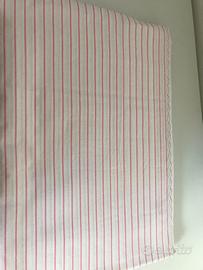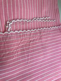 Lenzuolo matrimoniale nuovo, sotto con angoli e federe rosa a righe bianche, sopra bianco a righe rosa. Federe con voulant attorno come da foto. Nuovo ancora nel suo imballo, è stato aperto solo per fare le foto.