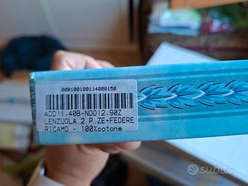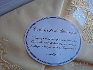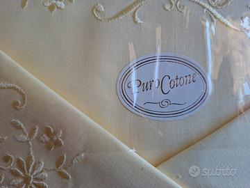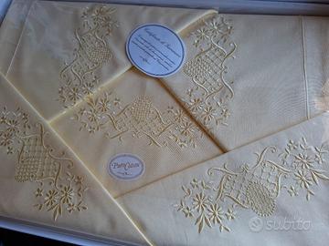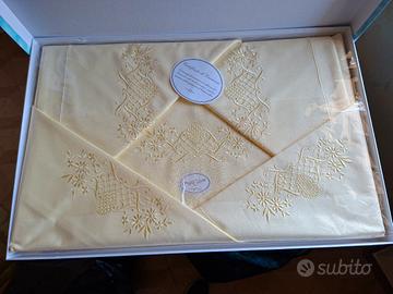 Vendo per inutilizzo lenzuolo matrimoniale parte di corredo prematrimoniale mai usufruita. colore giallo in puro cotone ricamati. confezione integra.