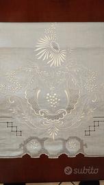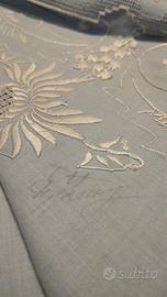 Abbondante e laborioso ricamo; presente anche la firma della ricamatrice che ha eseguito il lavoro.