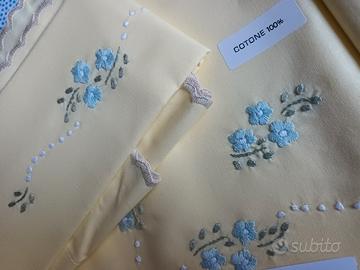Splendido lenzuolo matrimoniale sopra + 2 federe. Ricamato a mano, il vero morbido cotone di altri tempi.