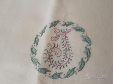Il set è interamente rifinito a mano con orlo a giorno tradizionale. Le federe e il lenzuolo presentano cifre ricamate (una "i" in corsivo maiuscolo) con filo in delicato color verde salvia e rosa antico, in stile classico e raffinato.