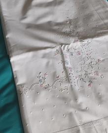 lenzuolo matrimoniale in puro cotone, composto da lenzuolo sopra bianco con ricami e due federe