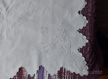 La parte alta del lenzuolo è finita con uno smerlo e ricami negli angoli come da foto.