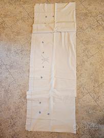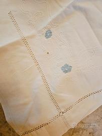 Lenzuolo ricamato vintage, con ricami floreali azzurri e dettagli traforati. Misure 225×235, ha solo un piccolo difetto (vedere ultima foto),diversamente e in ottime condizioni. Non ha etichetta, comunque credo che è cotone, era dei miei nonni. Vendo a un ottimo prezzo di 30€. Le foto sono parte integrante della descrizione.