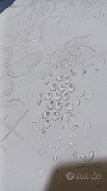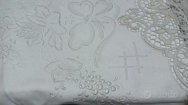 Lenzuolo matrimoniale vintage, in cotone, con applicazioni in merletto tipo burano e ricami.