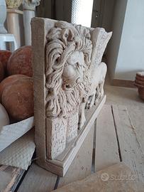 leoni in San marco lavorati a mano in marmo trani. Misure primo leone : 62×H45×10 Misure secondo leone con la spada 63×H43×10 Prezzo per cadauno.