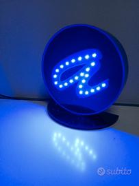 lettera LED inserita su scatolato in plexiglass diametro cm 24, profondità cm 6 con base di appoggio cm 24 ,luci blu intenso con alimentatore 12v.