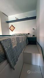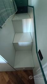 Due pratici cassettoni integrati nella scala e comoda panca perfetta per riporre oggetti vari come cuscini o piumoni.