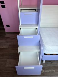 Vendo composizione cameretta composta da 2 letti singoli con doghe in legno per materassi 90x195cm completa di scaletta formata da 3 cassetti contenitore.