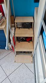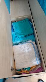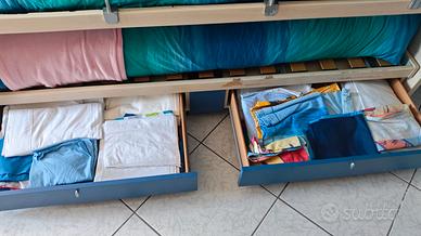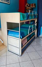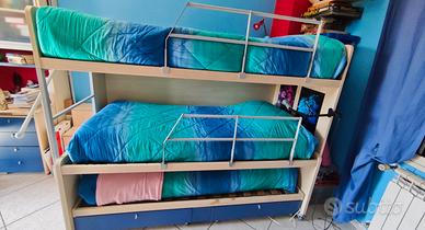 Struttura di 3 letti a castello scorrevoli in legno d'abete e ferro, con ampio spazio per conservare lenzuola e oggetti vari. Presenta alcuni segni d'usura, come qualche scheggiatura negli angoli del letto più basso e qualche problema alle ruote dello stesso. I materassi sono inclusi, i comodini invece sono esclusi. Trasporto a carico dell'acquirente. Prezzo contrattabile.