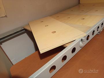 2 letti a semi castello con tavolo/scrivania a scomparsa,scorrevoli su binario ,pratico e salva spazio,ideale per cameretta dei bambini, sistema brevettato di Di la ddo e Perego,vendesi! Il tutto viene fornito già smontato.