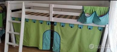 Struttura letto semi elevato, in buono stato, modello papallona, in legno non laccato. La struttura è già smontata ed imballata con istruzioni e ferramenta. Altezza sotto letto di 80 cm, altezza totale massima 114 cm. Materasso non disponibile e scaffali presenti in foto non disponibili.